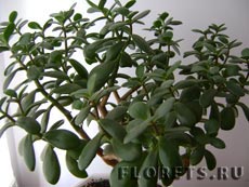 Крассула яйцевидная, или овальная (Crassula ovata) - многолетнее кустарниковое суккулентное растение, происходящее из Южной Африки, вид рода Крассула (Crassula), семейства Толстянковые (Crassulaceae). Растение высотой до 180 см, со стеблями, одревесневающимися и становящимися коричневатыми снизу. Листья многочисленные, мясистые, клиновидные, блестящие, иногда с красноватой окантовкой. Цветы крассула образует небольшие, похожие на мелкие звёздочки, с белым или светло-розовым венчиком; время цветения - осень и зима. Один из выведенных сортов - Crassula ovata Hobbit , растения этого сорта отличаются карликовыми размерами.
